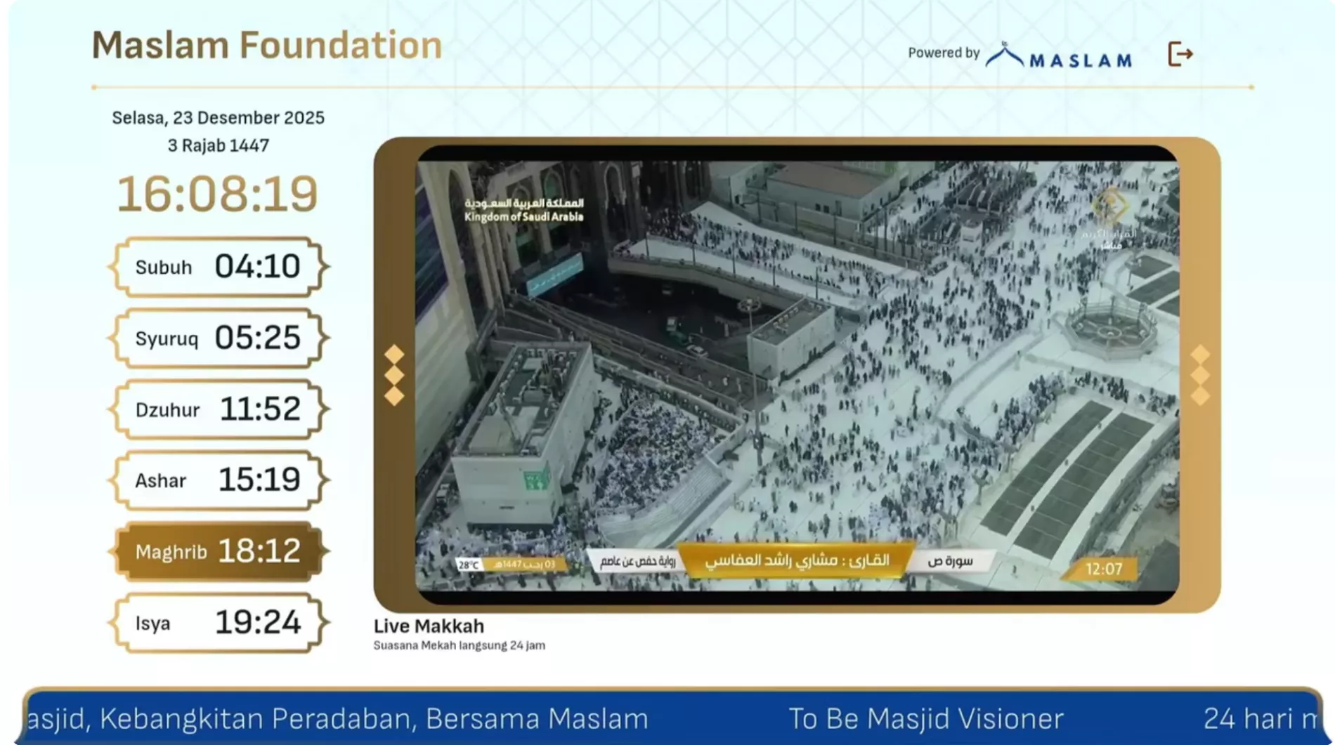 Dengan tampilan visual yang bersih, dinamis, dan tertata, Maslam TV menjadikan layar TV masjid sebagai media informasi yang hidup, bukan sekadar pajangan. Jamaah dapat dengan mudah memahami informasi tanpa harus bertanya atau mencari pengumuman manual. Bagi pengurus masjid, Maslam TV membantu menyampaikan amanah informasi secara lebih profesional, transparan, dan berkelanjutan.